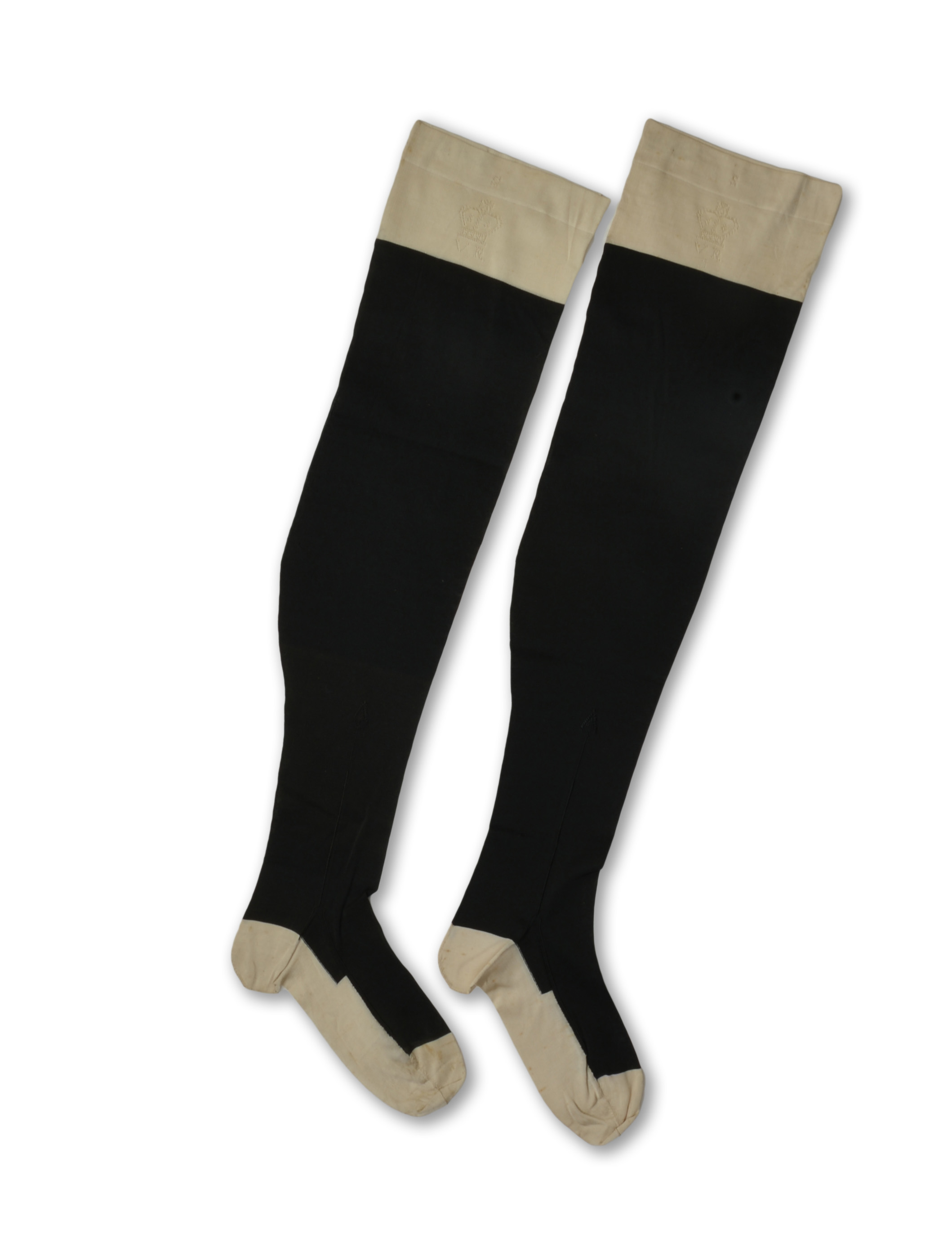 Fully fashioned; deep top in white with 2.8cm deep welt; leg and top of foot in black; heel, sole and toe in white; back seam; 'English' foot; across toe seam stitched in white, side seams stitched in black; clocks embroidered in black silk, horizontal above sole seam, vertical at heel seam, joining to go up ankle, ending in kite shape of squares and rectangles of stitches under chevron of 2 rows of stitches, spot at point, 2 blocks at ends; crown above "V R" knitted in holes below welt mark: knitted in, "5" below one welt, "S" on welt, "W" inside welt ("S W" for Swears and Wells)