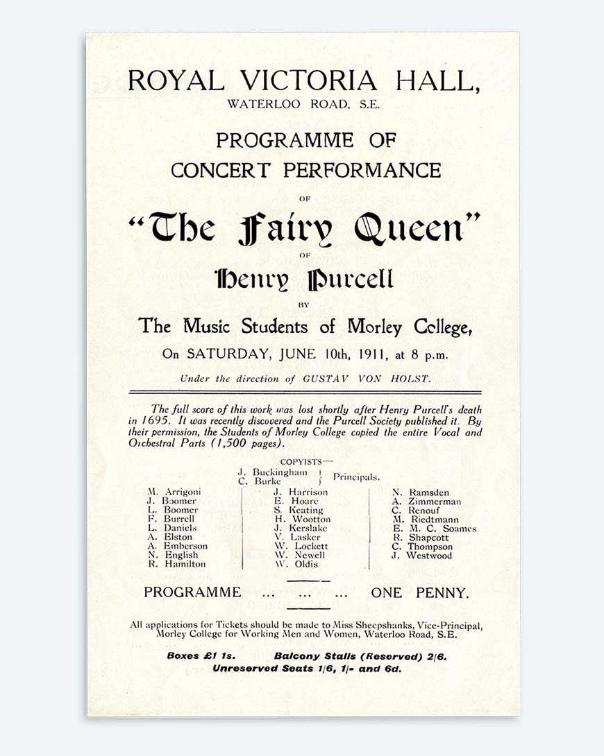 Concert Programme from 1911 at the Morley College of 'The Fairy Queen' by Henry Purcell and the musical direction of Gustav Von Holst. To listen to the fairy queen score please click here.