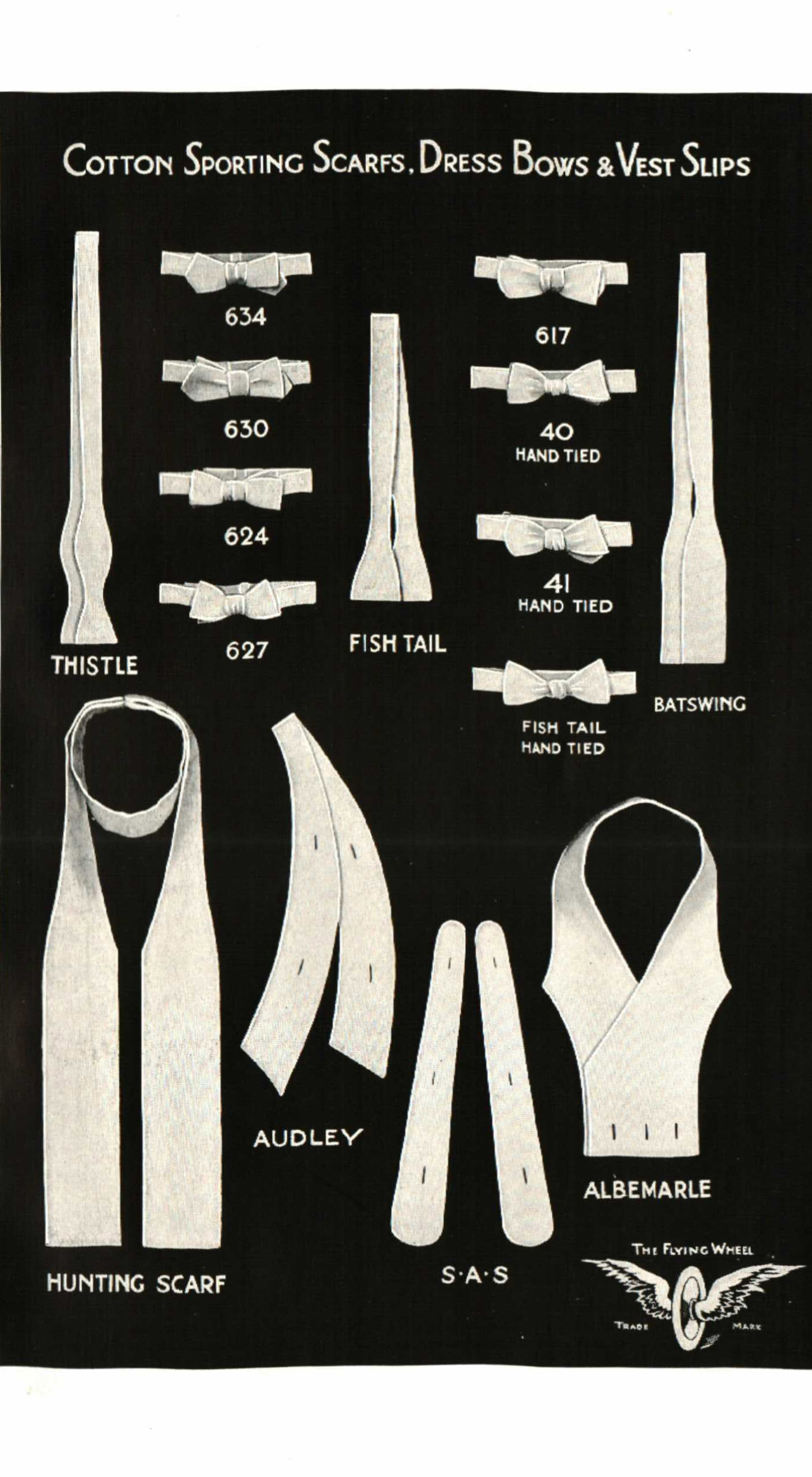 "Cotton Sporting Scarfs Dress Bows and Vest Slips" for Men advertisement, I & R Morley's Catalogue Spring 1923. Showcasing "Fish Tail", "Hand Tied", "Batswing", "S.A.S" and "Hunting Scarf" designs.