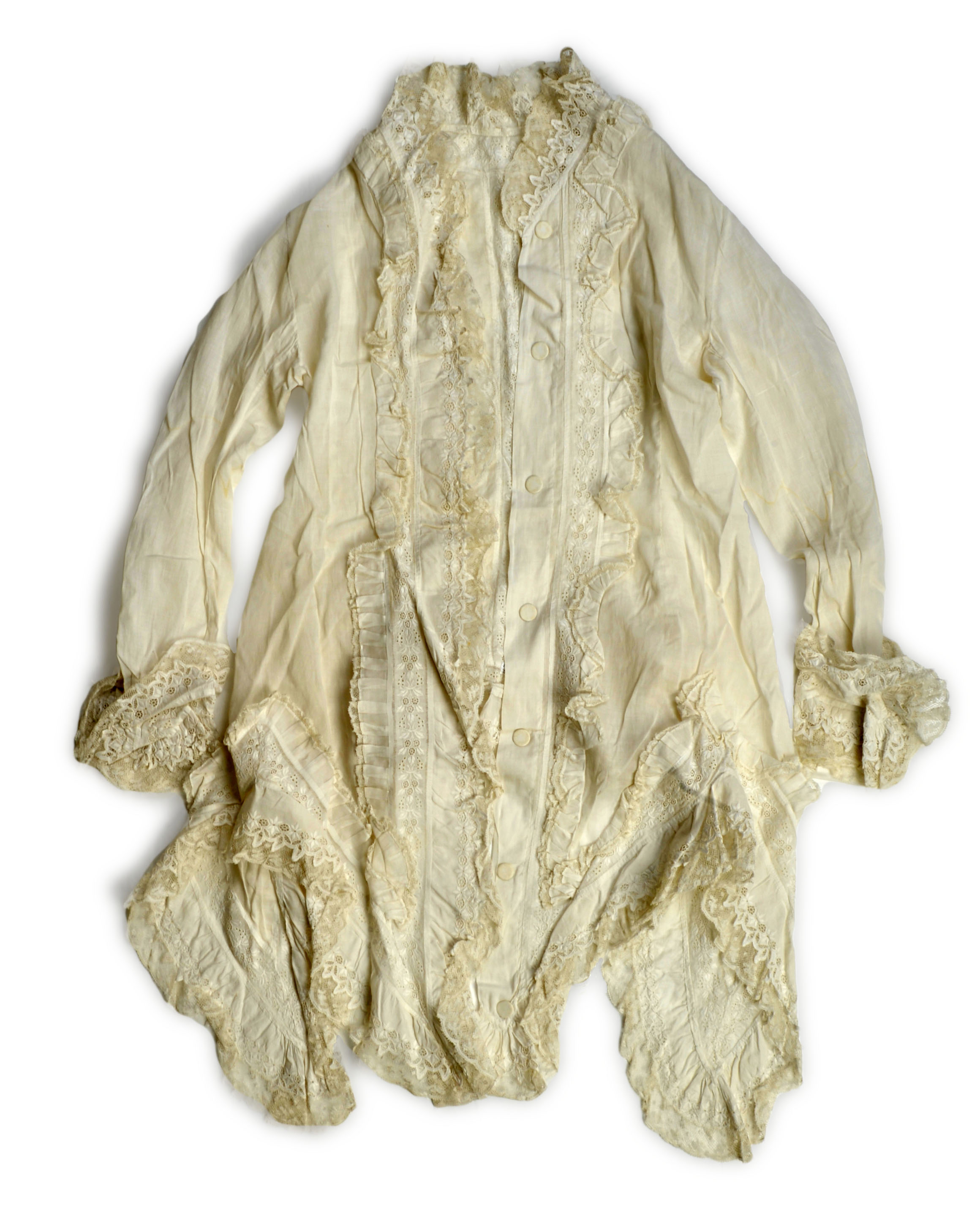 Women's Dressing-Jacket. White cambric, machine-embroidered insertion, Leavers machine-made lace border. I. and R. Morley, Nottingham, 1870-1880