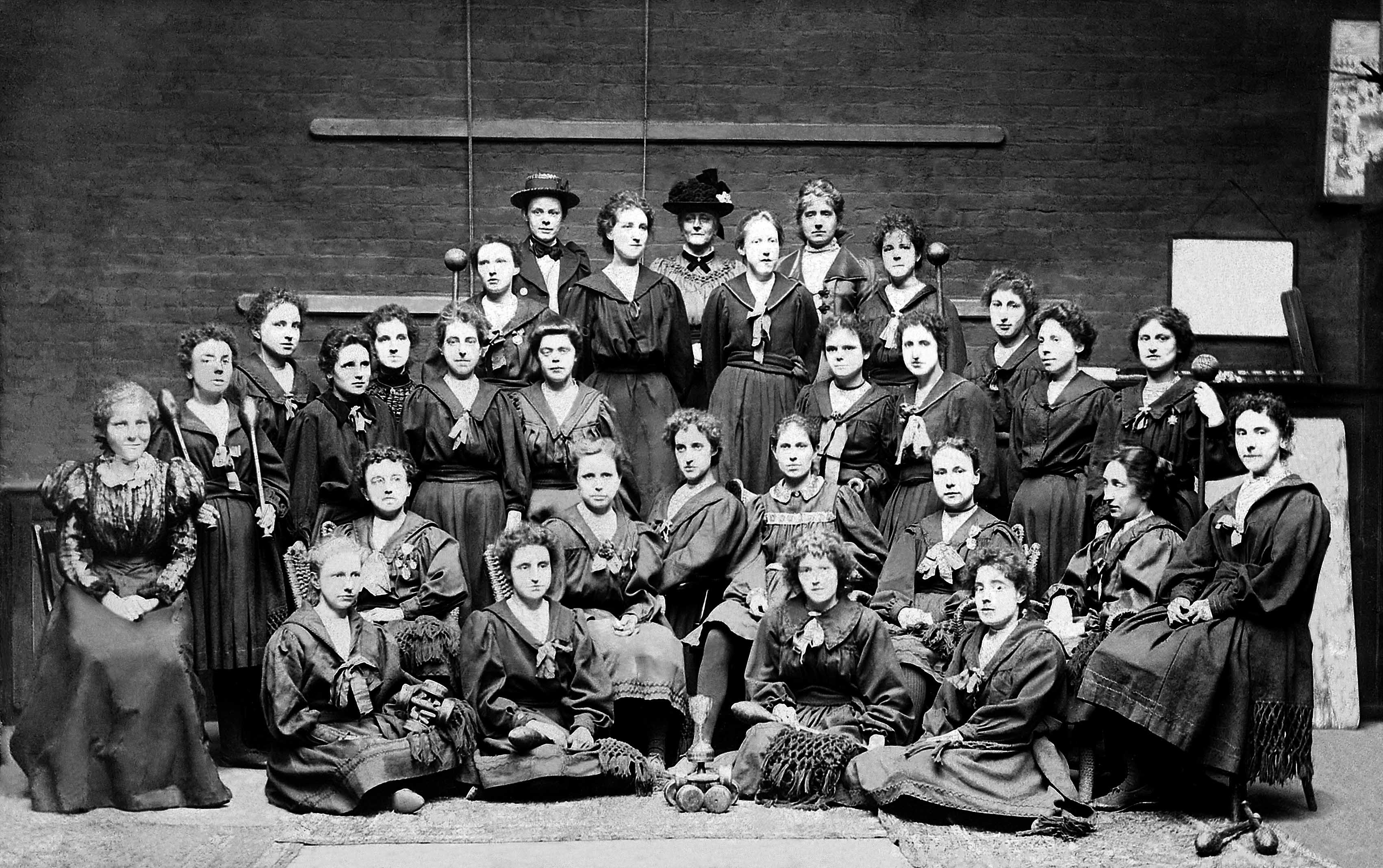 Photo of the gymnastic Class of 1895. The photo shows ladies in the college gymnasieum. A report around this time of the gymnastics display in 1894 states, “The tug of war was quite exciting, and the energy put forth in the struggle would have surprised anyone unacquainted with the muscular abilities of the fair sex”.