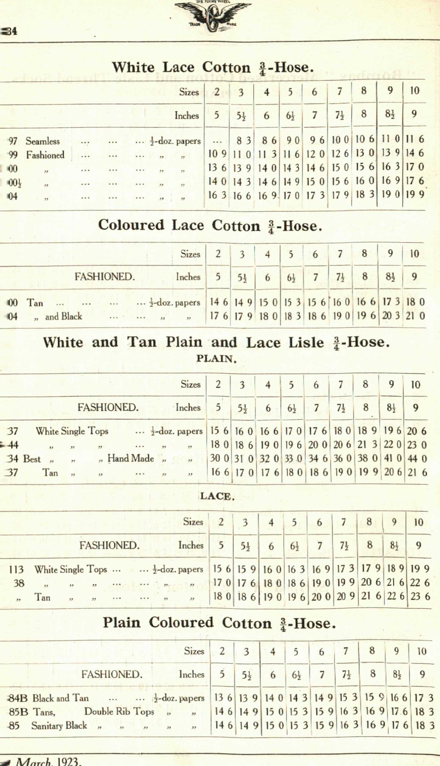 Hosiery Size List, I & R Morley's Catalogue Spring 1923.
