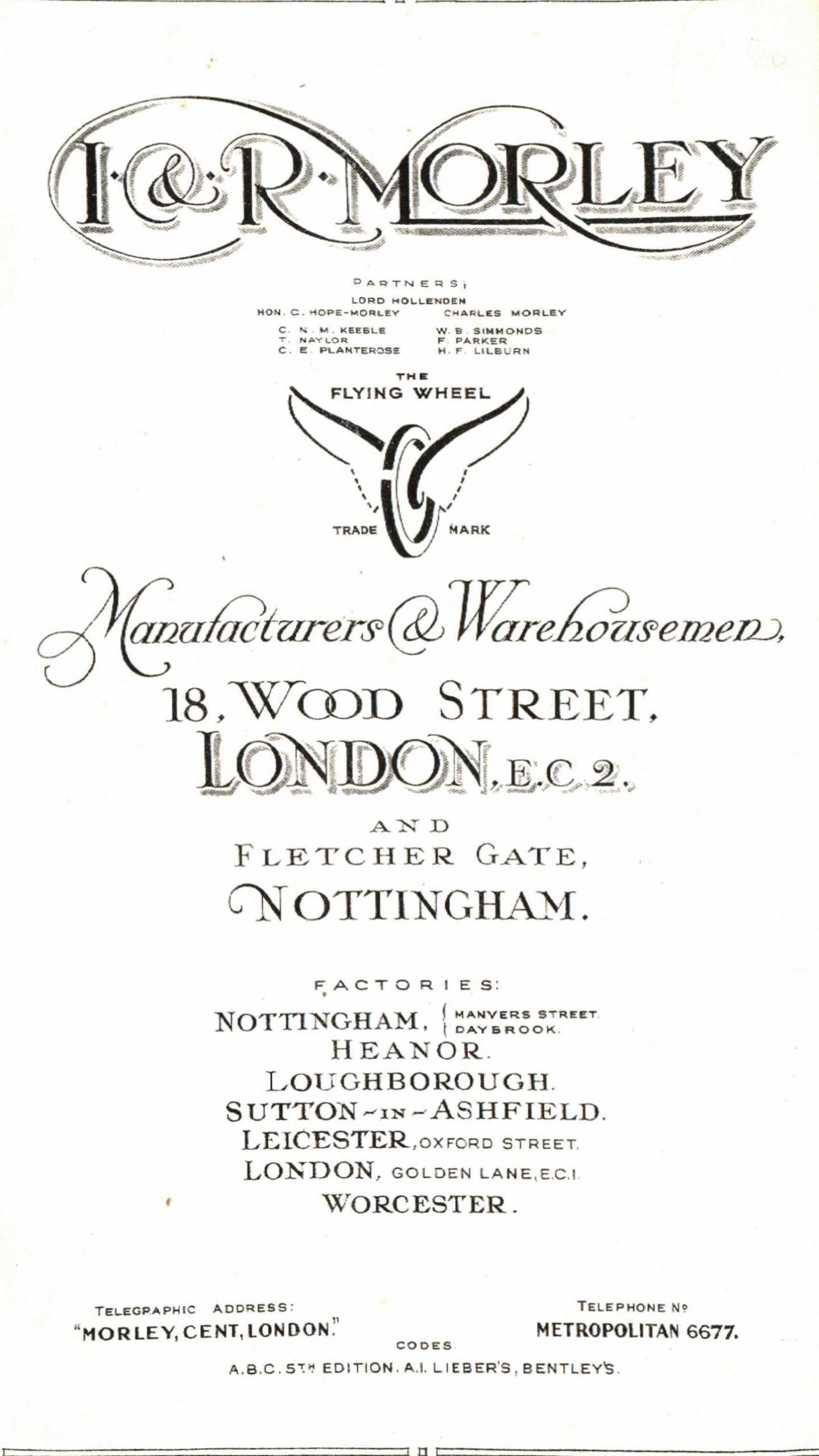 I & R Morley Contact List 1930 found in the I & R Morley's Catalogue Spring 1930. Note that compared to the other contact list from 1923, Handel Street is missing from the list of Nottingham Factories.