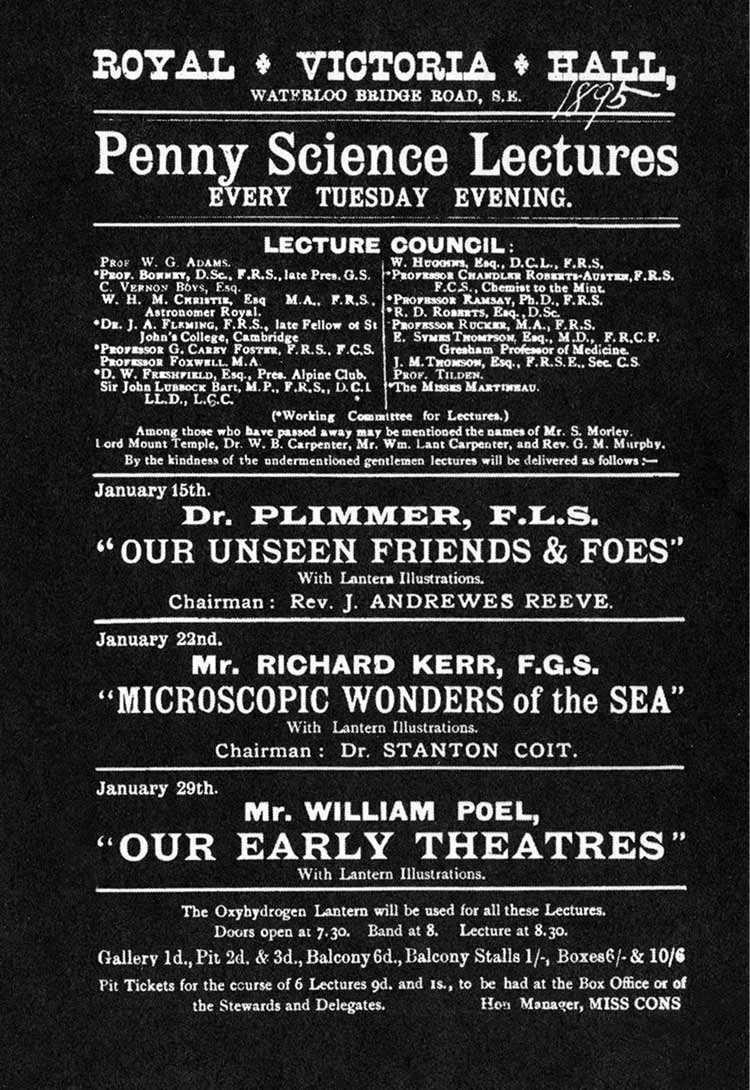 A 'Penny Lectures' advert from January 1895 at the Royal Victoria Hall (The Old Vic). Every Tuesday the lectures would feature informative seminars from eminent scientist and philosophers presented on 'oxyhydrogen lanterns' (early modes of projecting images).