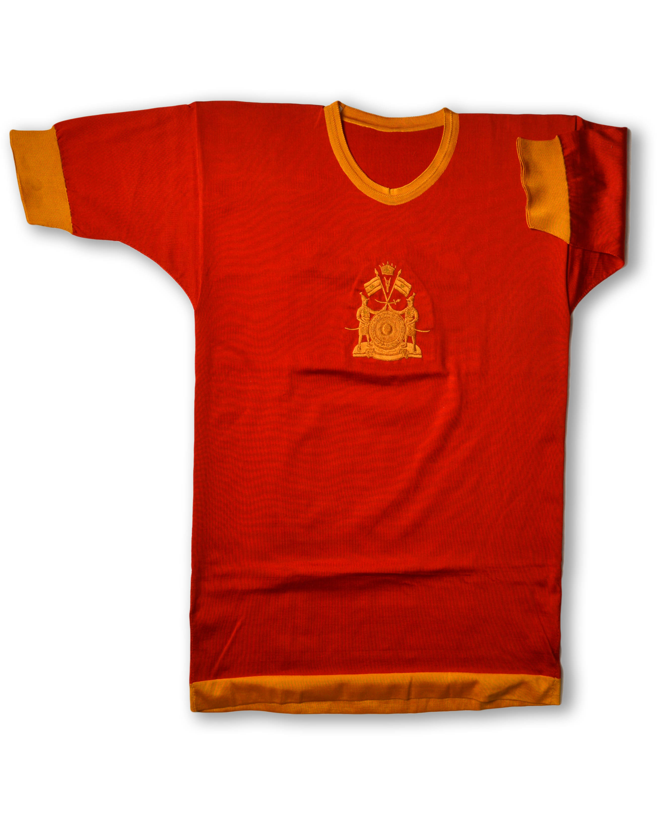 Scarlet silk Polo Shirt made for His Highness Sir Hari Singh the Maharajah of Jammu and Kashmir. "O Department, Red Silk Polo Jersey, Made for the Maharajah of Kashmir and embroidered with the Kashmir coat of arms. Made at Heanor in the early 1930s". I. and R. Morley, Heanor, Derbyshire, 1930- 1934