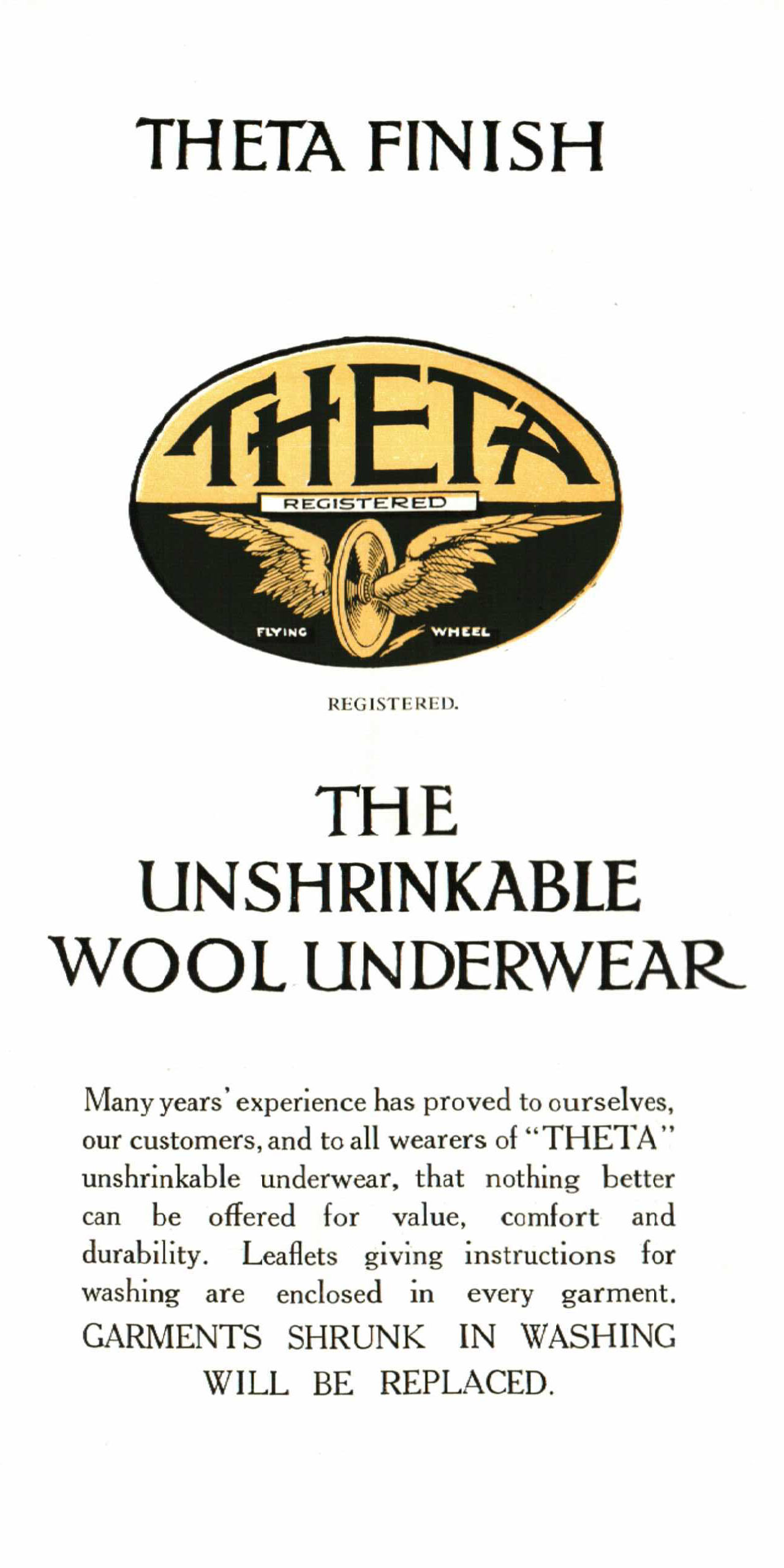 "Theta Finish The Unshrinkable Wool Underwear" advertisement, I & R Morley's Catalogue Spring 1930.